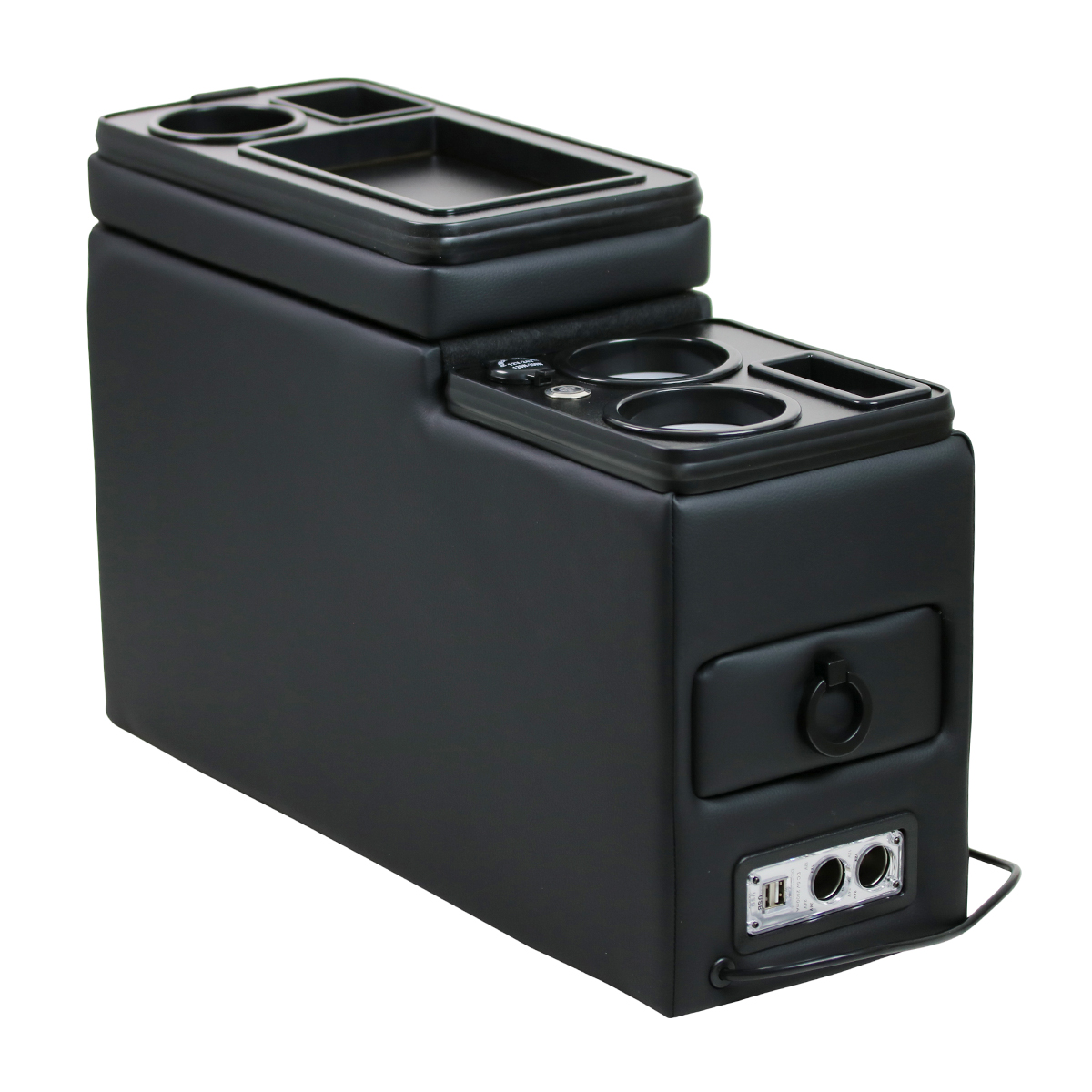 - 2x USB-Ports und 2x 12V Steckdosen vorne und 3x USB-Ports hinten, 1x 12V Steckdose oben