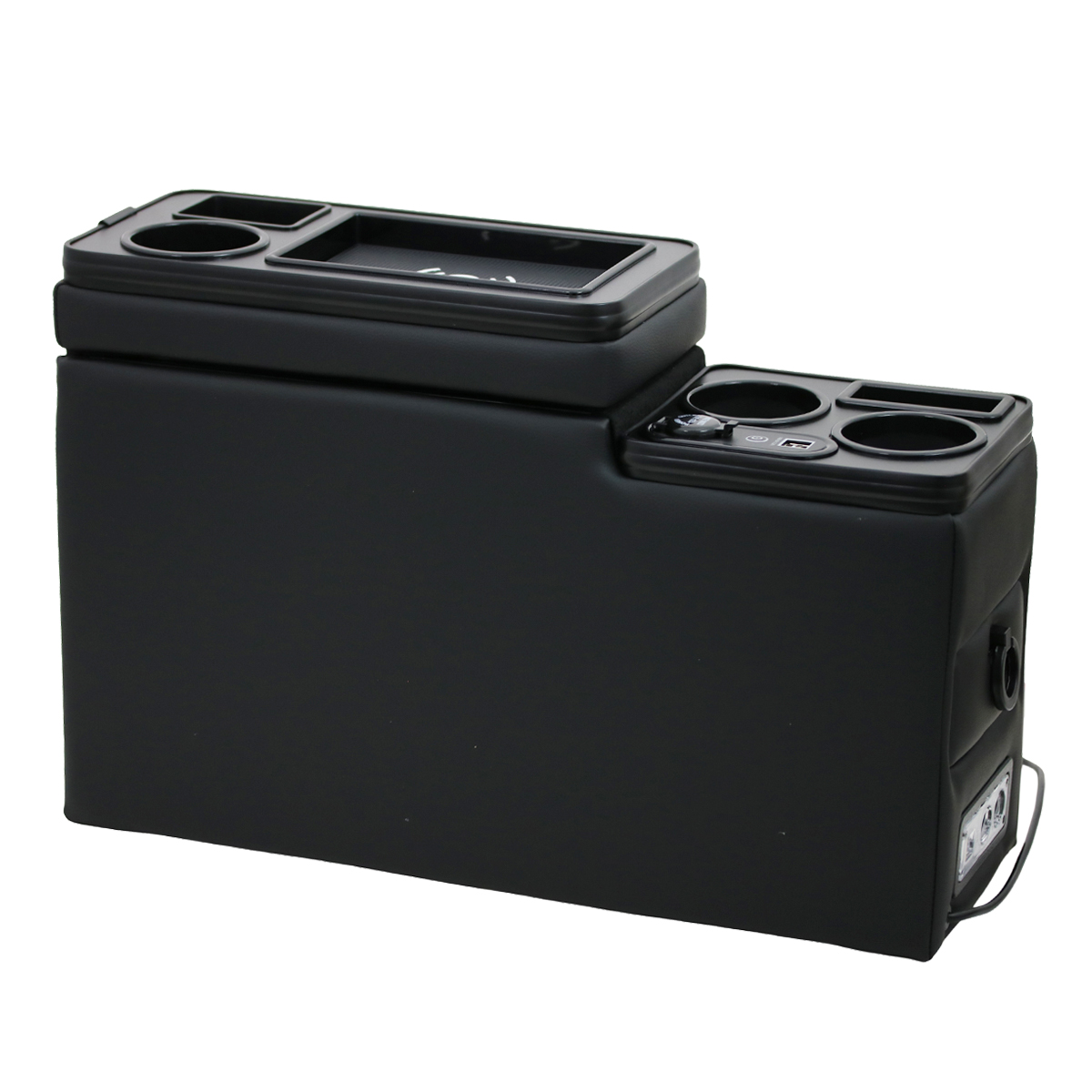 - 2x USB-Ports und 2x 12V Steckdosen vorne und 3x USB-Ports hinten, 1x USB-Port, 1x USB-C Port und 1x 12V Steckdose oben